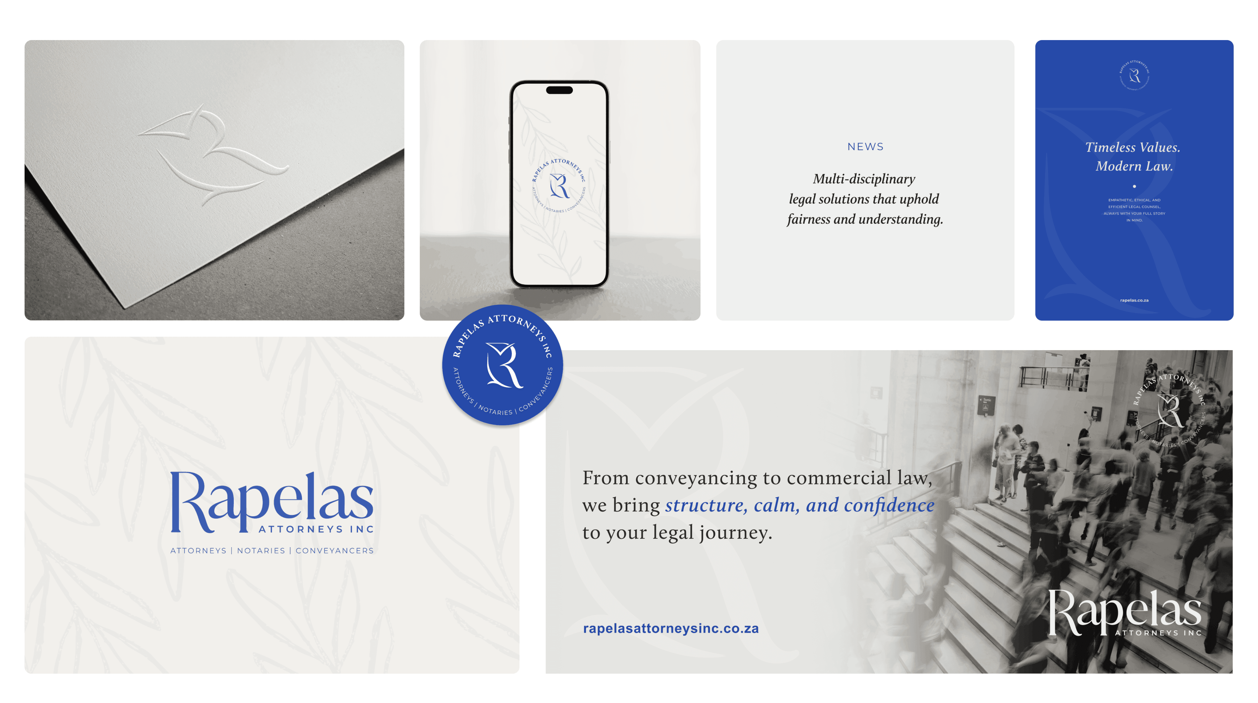 Rapelas Attorneys Inc. is a boutique legal practice offering commercially focused legal services with clarity, precision, and personal attention. The brand identity reflects this approach through refined typography, a restrained colour palette, and sophisticated visual elements that convey professionalism and trust. Elegant layouts, subtle iconography, and confident use of space create a modern legal brand that balances authority with approachability. Across digital and brand touchpoints, the design reinforces Rapelas’ commitment to delivering clear, structured legal solutions with confidence and care.
